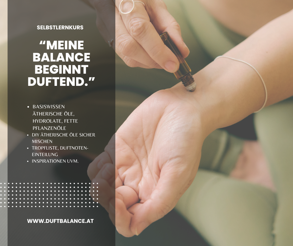 Selbstlernkurs “Meine Balance beginnt duftend.” – bestehend aus 5 Modulen und unterstützt dich ätherische Öle sicher und harmonisch zu mischen. Du lernst Kontraindikatoren, Mischvarianten, Trägersubstanzen und vieles mehr kennen. Ich gebe dir eine Menge Informationen zu den einzelnen ätherischen Ölen, fetten Pflanzenölen, Hydrolate und so kannst du dir Naturkosmetik Produkte, Pflegeprodukte uvm. erstellen – um eine Hilfestellung für körperliche und energetische Ausgewogenheit zu erhalten. Wenn du eine Teilnahmebestätigung wünscht, sind dafür Lernaufgaben (Reflexionen, Fragenbeantwortung) abzugeben. Die Unterlagen erhältst du elektronisch nach Zahlungseingang.
