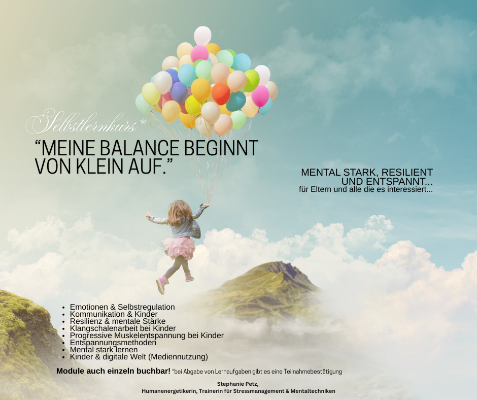 Selbstlernkurs “Meine Balance beginnt von klein auf.” – bestehend aus 8 Modulen und unterstützt Eltern dem Kind ein wichtiges Werkzeug in die Hand zu geben “Mentale Stärke, Resilienz und Entspannung.” Dieses Wissen unterstützt die Ausgewogenheit deines Kindes und macht es fit für den Lebensweg – das Wissen nimmt einem niemand mehr! Du alleine entscheidest was du vom Kurs für dein Kind mitnimmst und anwendest. Der Kurs ist empfehlenswert für Eltern und alle die es interessiert, ab ca. 4-12 Jahren. Es gibt Module, die sind schon ab Geburt und Module erst ab ca. 7 Jahren interessant . Wenn du eine Teilnahmebestätigung wünscht, sind dafür Lernaufgaben (Reflexionen, Fragenbeantwortung) abzugeben. Die Unterlagen erhältst du elektronisch nach Zahlungseingang. Jetzt zum Inskriptionspreis bis 24.12.25 – Zahlungseingang bis 31.12.25 (alle fertigen Module werden dir spätestens am 15.11.25 übermittelt, die restlichen Module bis 01.01.26).